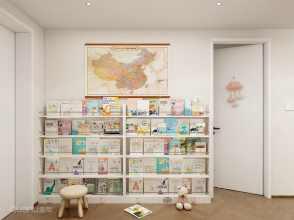 在走廊尽头定制开放式镂空薄柜,使所有绘本封面清晰可见,可以激发孩子的阅读兴趣,将过道空间打造成儿童阅读角。
