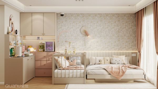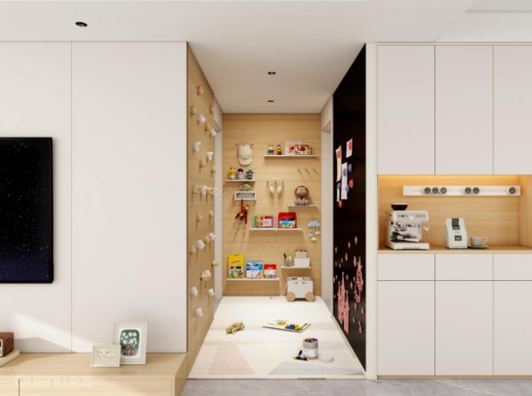 若想在卧室打造多功能育儿区,可通过转角储物柜实现。转角高柜嵌入消毒柜与恒温水壶形成喂养台,转角矮柜设尿布更换区,后方浅柜分类收纳护肤用品。所有功能围绕家长操作动线展开,让育儿护理更轻松省力~