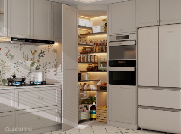 厨房转角可采用五角柜设计,内部设置250-840mm隔板进行错层收纳。底层存放米面粮油,中层收纳调味品,上层囤积干货,搭配感应灯带和分类收纳盒,鸡肋角落也能变身高效仓储区。
