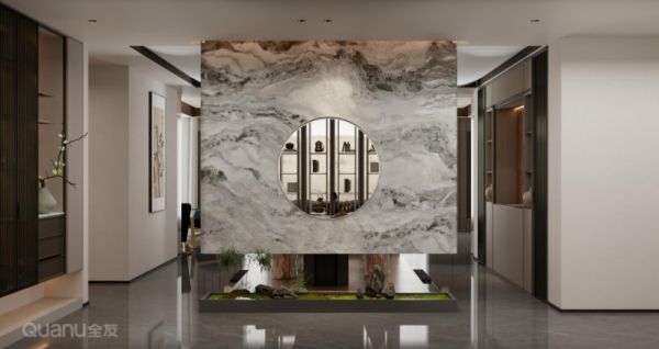 选用天然大理石打造轻薄墙体,以山水纹理营造视觉焦点,在明确划分空间的同时保持通透感。既有效保障隐私,又通过石材质感提升空间高级感。