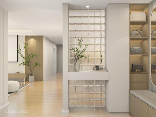 通过磨砂玻璃巧妙分隔玄关与客厅,透光不透影的设计既明确功能分区,又保持空间通透感,视觉上扩大空间。