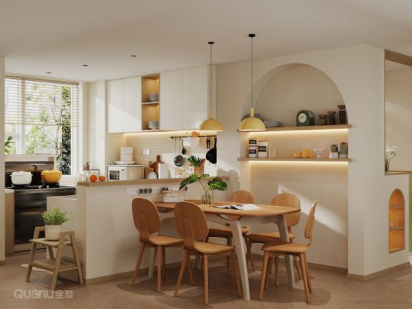 餐厨空间可采用一体化开放式设计,以岛台为核心衔接厨房与餐厅。餐边柜搭配开放式层板,方便常用餐具与厨具的随取随放,既提升了备餐效率,也延展了空间的视觉面积。