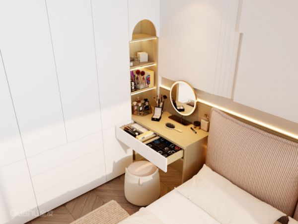 卧室内通过L型布局,将衣柜与梳妆台无缝衔接。衣柜采用到顶设计,内部实现精细分区。梳妆台巧妙嵌入转角,搭配开放格与抽屉,既完善了功能,又将衣帽区与卧室空间完美整合。