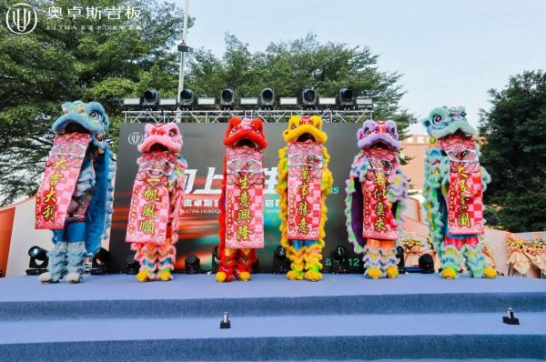 在品牌愿景分享后的重要时刻,奥卓斯岩板举行了传统点睛与剪彩仪式。奥卓斯岩板总经理于洪宝与中国建筑卫生陶瓷协会副会长宫卫、佛山市陶瓷行业协会会长尹虹博士、香港国际建材总经理冼兆龙、深圳古家建材董事长古明、瑞坤国际·正方良行首席设计师徐庆良老师作为主礼嘉宾共同为瑞狮点睛,寓意品牌获得洞察市场的智慧与开拓未来的活力。