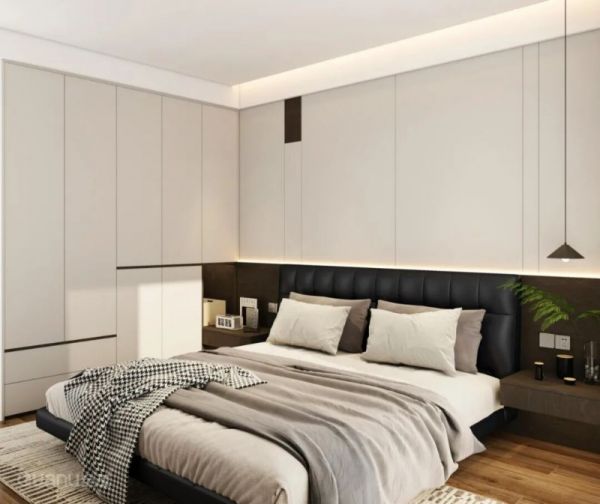 在床头配置储物柜,延伸出的开放格作床头柜,维持睡眠区舒适度的同时,大幅提升卧室的储物容量。
