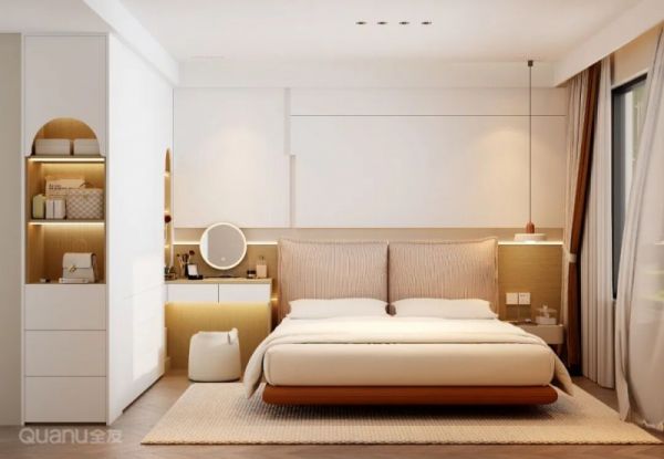 倘若需要独立化妆区,可在床尾打造悬浮梳妆台。