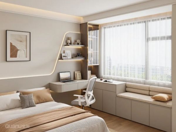 沿飘窗打造一体化书桌柜,左侧设置办公区放电脑,右侧留出休闲区摆放书籍。飘窗卡座与书桌自然衔接,底部暗藏储物空间,既可作为舒适座位,又能收纳杂物。
