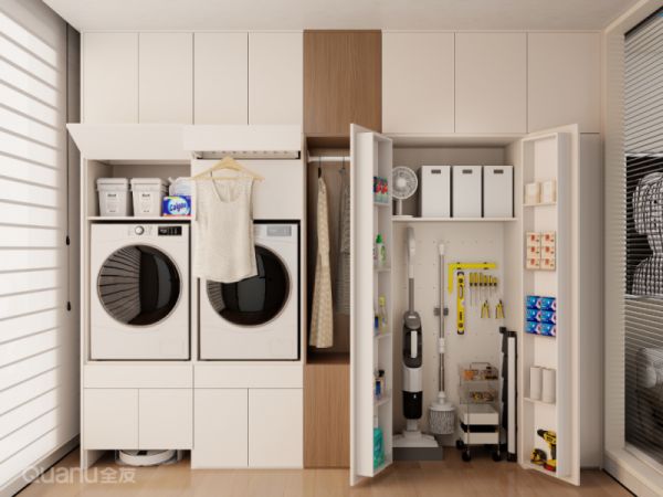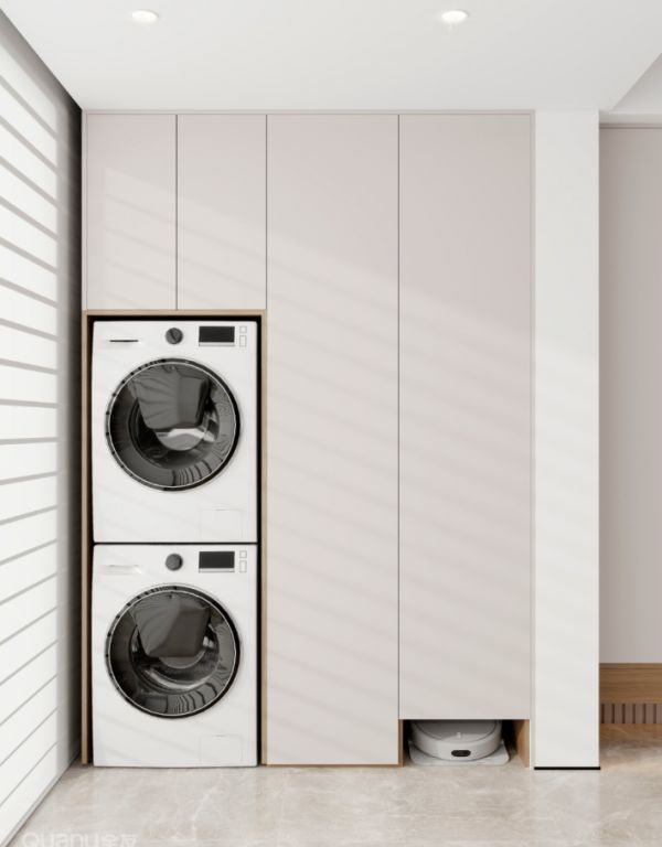 在阳台设计家政柜,底部预留嵌入式舱位,让扫地机完美融入家政清洁区,实现一站式收纳与清洁。