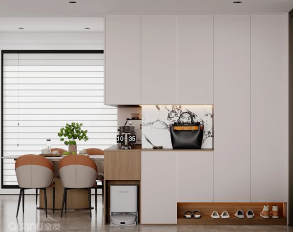 在玄关柜底部预留合适高度,根据扫地机尺寸精准定制专属舱位,既不占空间,又方便取用。