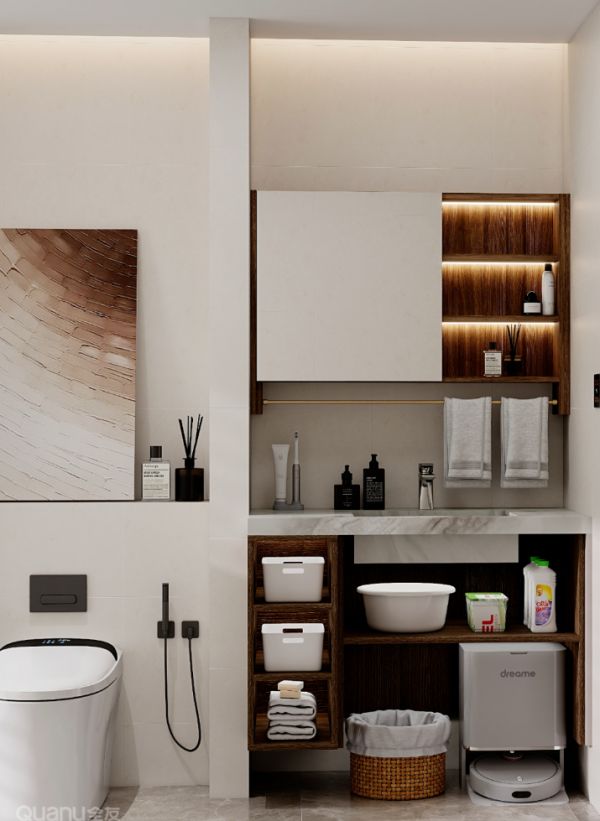 浴室柜作悬空设计,下方闲置空间正好用于放置扫地机。不仅避免了卫生死角,还方便扫地机水箱补水。
