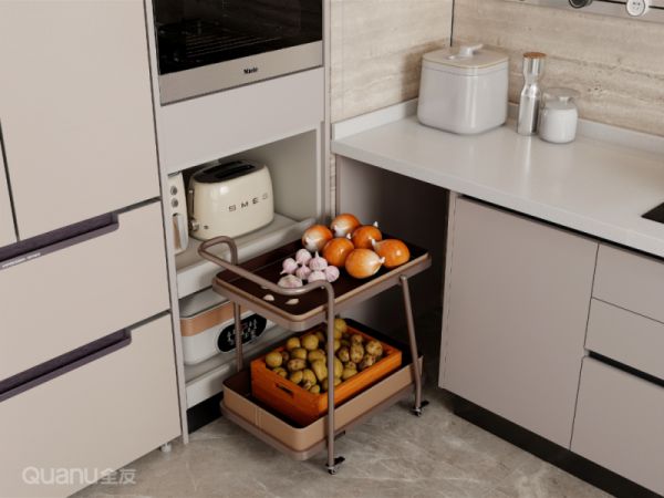 利用橱柜与台面之间15-20cm的窄缝,放入带滑轮的双层推车,用于收纳厨房杂物。
