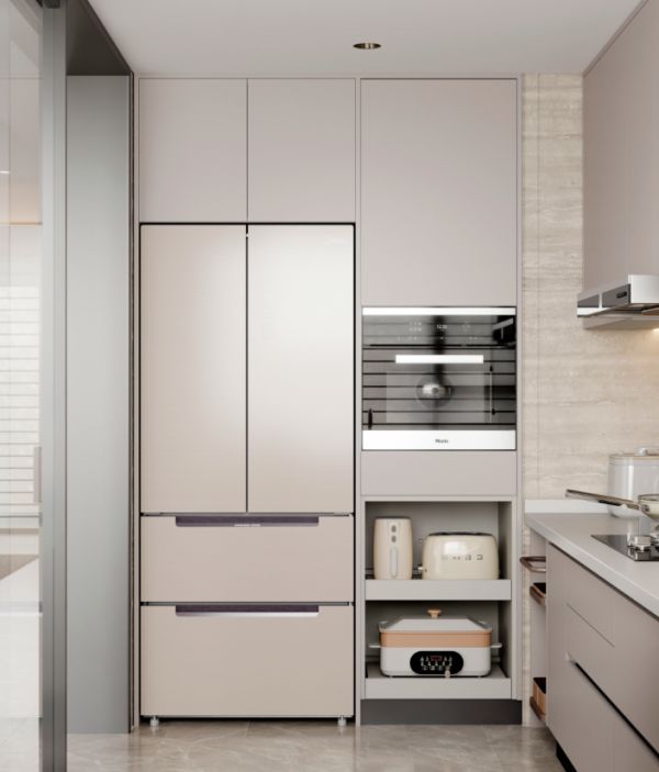 另外,还可将大型家电嵌入高柜,不仅优化了厨房动线,还提高了空间利用率。
