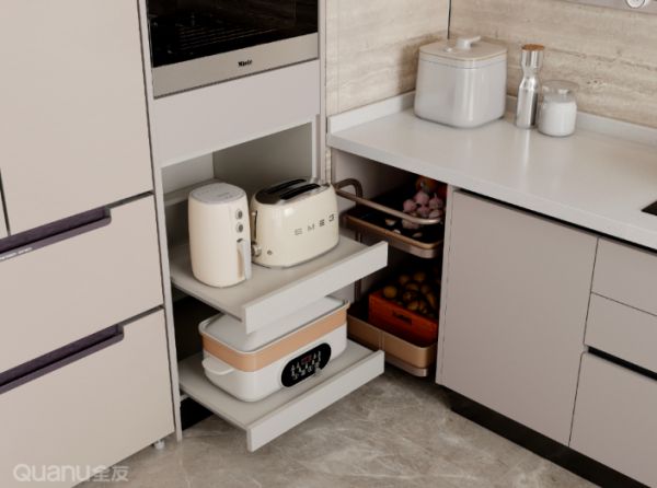 在橱柜内安装多层抽拉隔板,轻松一拉,所有家电便尽收眼底,取用格外便捷。