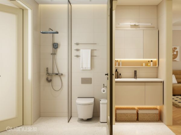 很多人烦恼洗衣篮没处放,其实只需将浴室柜悬空安装,底部留出的空间正好容纳洗衣篮,不仅充分利用了闲置区域,还让换洗衣物有了固定收纳点。