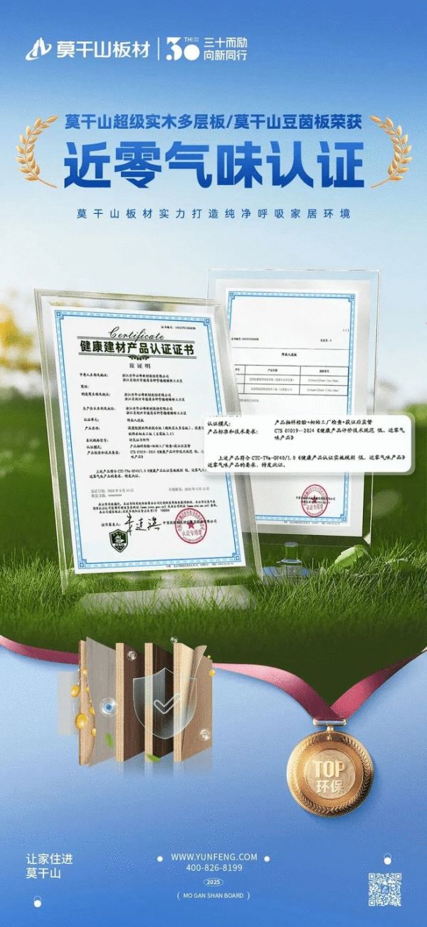 2025年,莫干山豆茵板与旗下核心产品超级实木多层板共同凭借出色的环保性能与近乎零气味的表现,成功荣获由中国国检集团颁发的近零气味健康建材产品认证证书。充分彰显了莫干山板材在攻克室内异味难题,降低TVOC等污染物方面的深厚技术实力与显著成果 。
