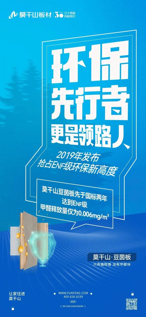 早在ENF级新国标推出之前,莫干山板材已率先在2019年推出了第一块ENF级环保板材——莫干山豆茵板。经权威专业机构检测,其甲醛释放量为0.006mg/m³,远超新国标ENF级标准(≤0.025mg/m³)。