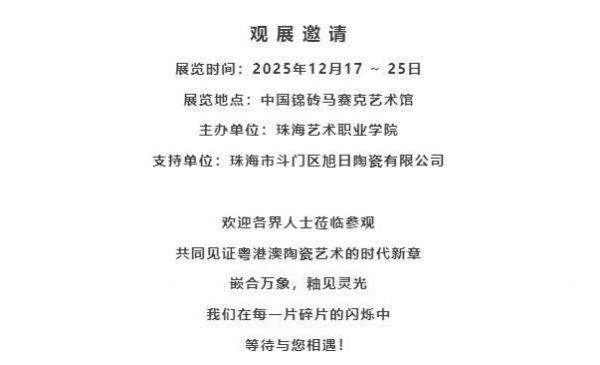 2025年12月17日下午,由国家艺术基金资助、珠海艺术职业学院主导、旭日集团(白兔瓷砖)鼎力支持的 《粤港澳陶瓷高温色釉技艺与陶瓷马赛克设计人才培训项目》作品展,在珠海市斗门区旭日陶瓷有限公司(以下简称“旭日集团”或“白兔瓷砖”)隆重开幕。本次展览以 “嵌合万象:陶瓷马赛克中的灵光碎片” 为主题,集中呈现了传统高温色釉与现代马赛克设计交融共生的艺术成果,标志着一次深度的“文化+设计+产业”实践的成功落地。