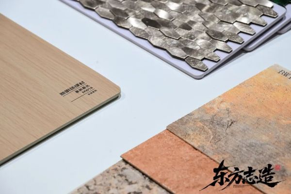 展位中和谐共生的多元材质,不仅是设计手法,更是新明珠绿材的核心竞争力之一。新明珠绿材是新明珠集团“建筑表面装饰系统化解决方案提供商”战略目标承接落地重要环节,材料库种类丰富多样,研发各种不同材质的多元化匹配、设计融合与落地交付。展位现场便呈现了很多种不同体系的绿色新材产品。