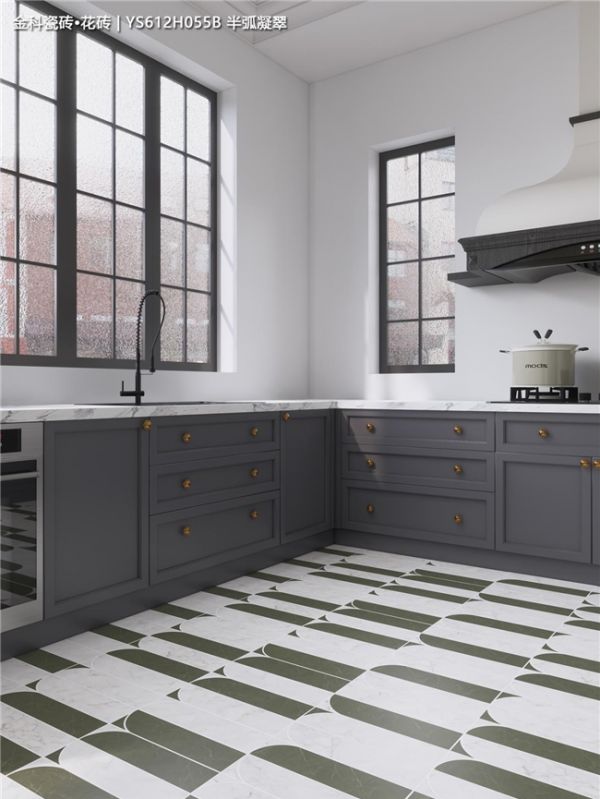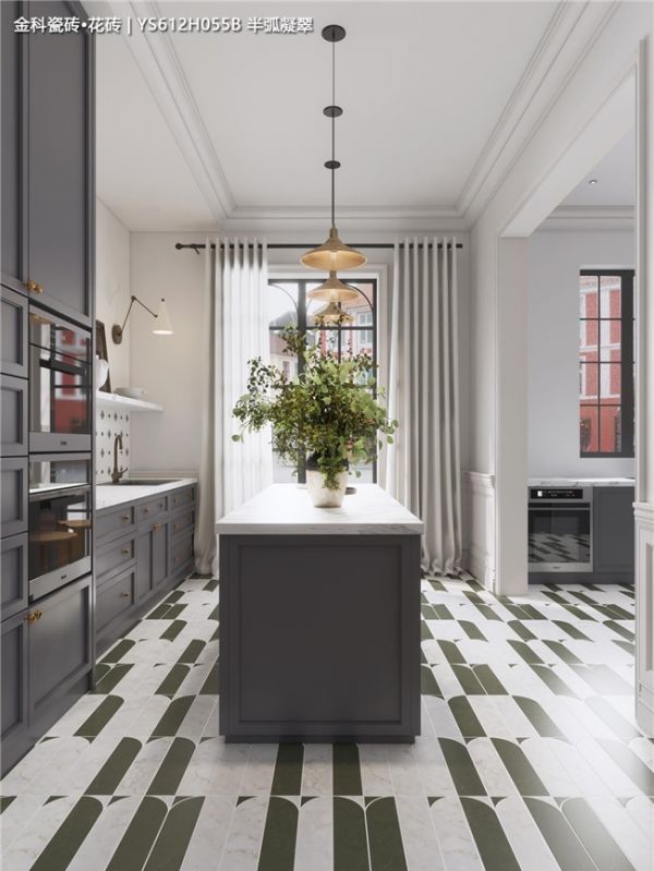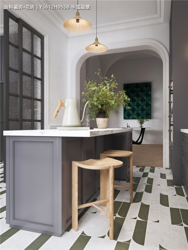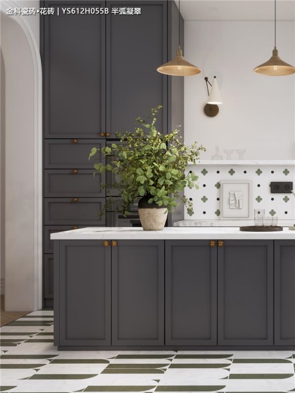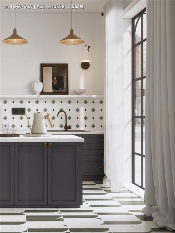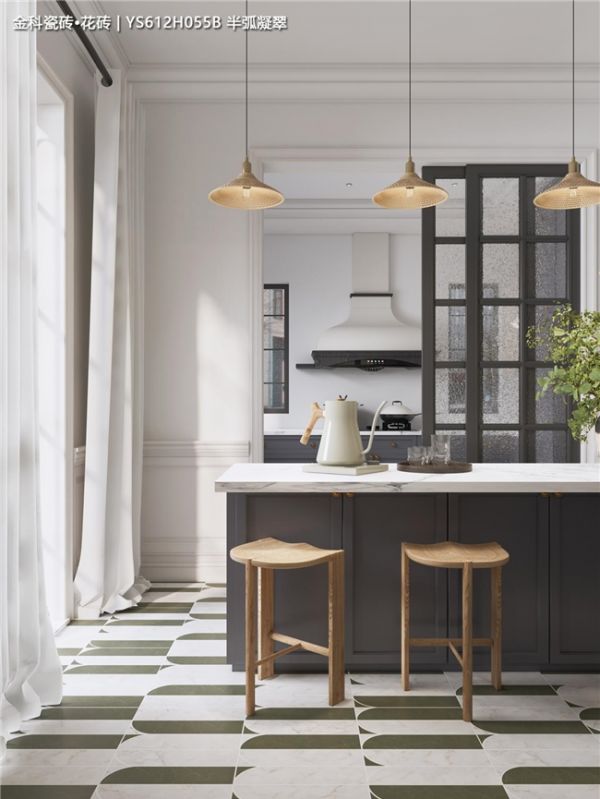 ▪️ 主色调:墙面、柜体可选用大白墙+深灰/哑光黑橱柜,能很好地衬托花砖的复古绿。