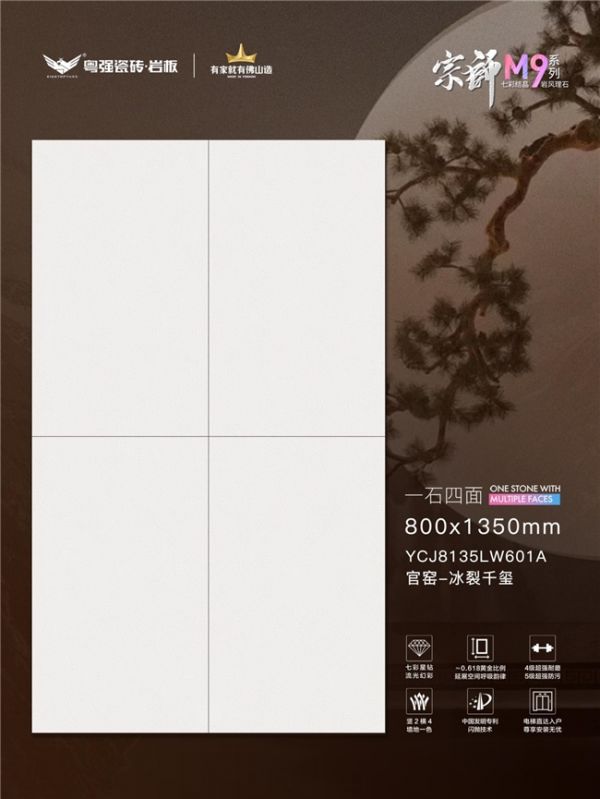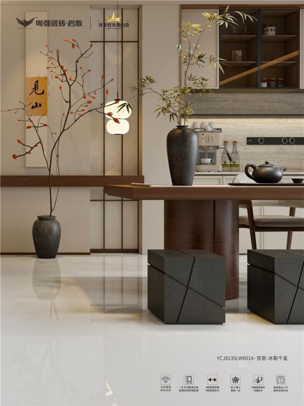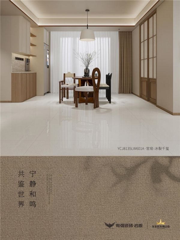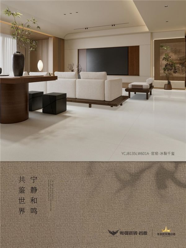 800*1350mm黄金分割比例,两片到顶的恢弘尺度,墙地一体对缝,勾勒空间的庄重与轻盈。官窑冰裂的雅致,融入现代家居的肃静之美,让每一寸空间,都成为东方美学的当代注脚。