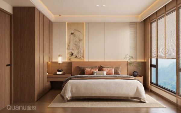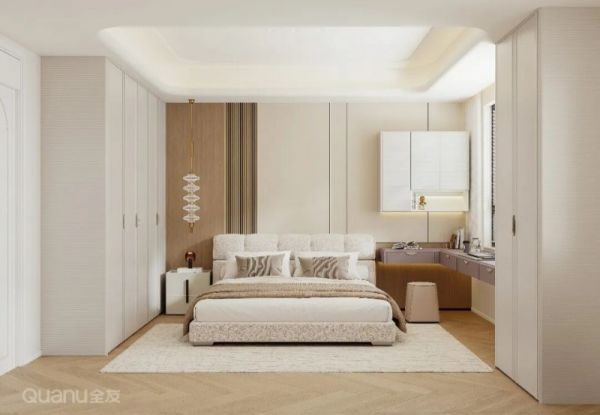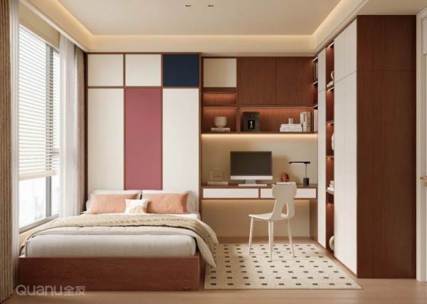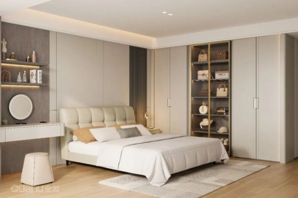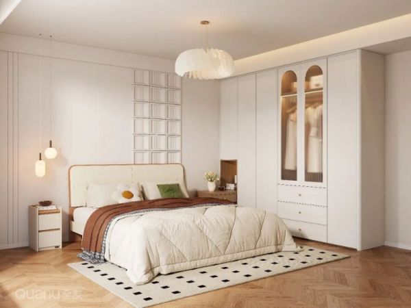 布局建议:床可靠墙放置,留出单侧通道搭配免拉手衣柜,节省过道空间。