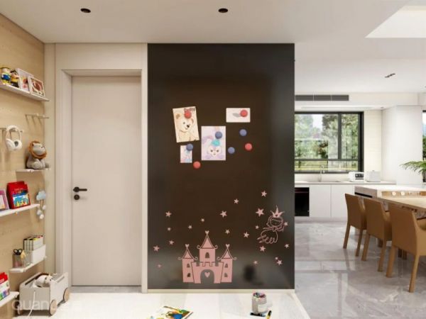 搭配粉笔和磁吸贴,墙面立刻变身多功能互动区:孩子能在这里写写画画,大人可以记录待办事项,过节时再随手画幅装饰画,家的仪式感瞬间拉满~