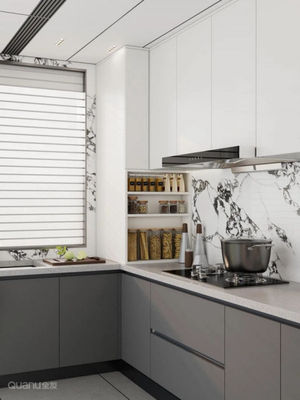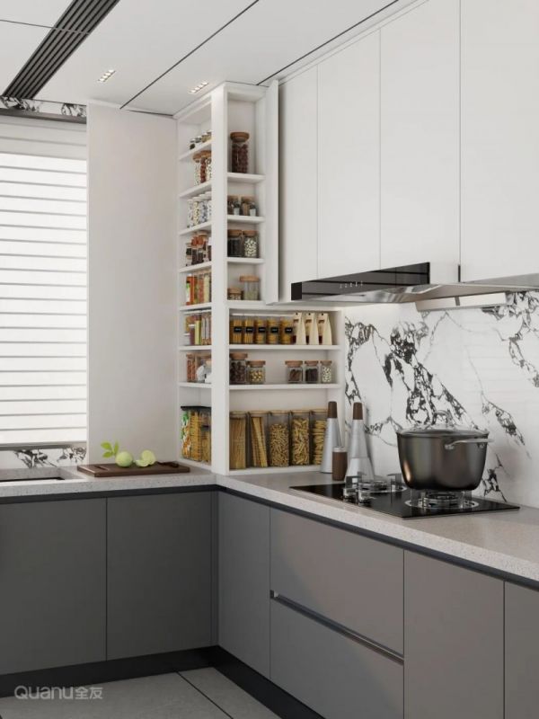 想告别厨房台面瓶罐堆积的烦恼?可以在烟道外侧的闲置墙面,嵌入一个15-20cm深的定制薄柜,鸡肋角落秒变高效收纳区!