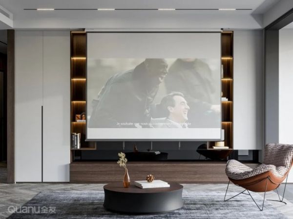 需要观影时,幕布降下,客厅变身沉浸式影院;日常居家时,幕布收起,所有杂物皆可藏入柜体,客厅整洁如初。