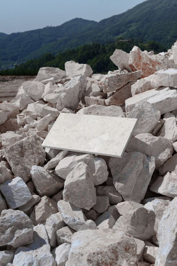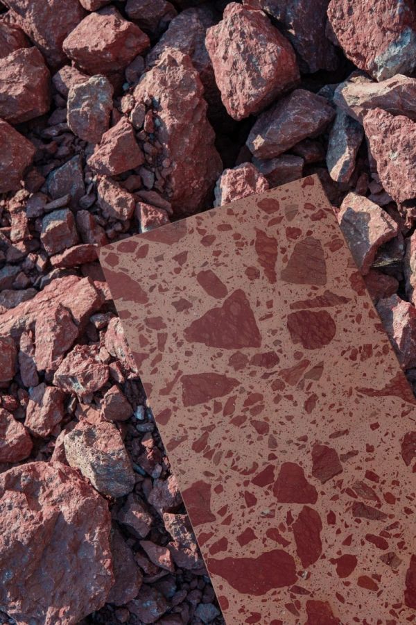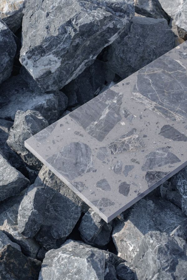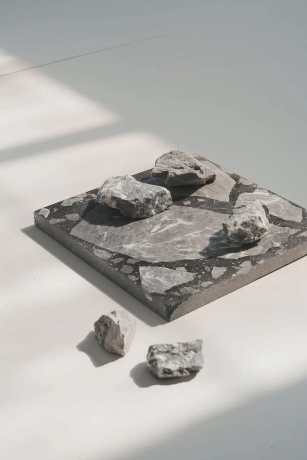 在多番的材料试验以及结合市场趋势进行分析后,东鹏新材研发团队最终选择了“超大骨料水磨石”的形式进行在地余矿的材料转化,并成功开发出在地生成2.0系列。该系列循环利用汉白玉、幻影灰和红砂岩余矿,保留矿石原生纹路与色彩,塑造更强的艺术感与视觉冲击力。产品固废占比最高达69%,让“矿山废弃物”蜕变为兼具环保价值与美学张力的绿色建材。