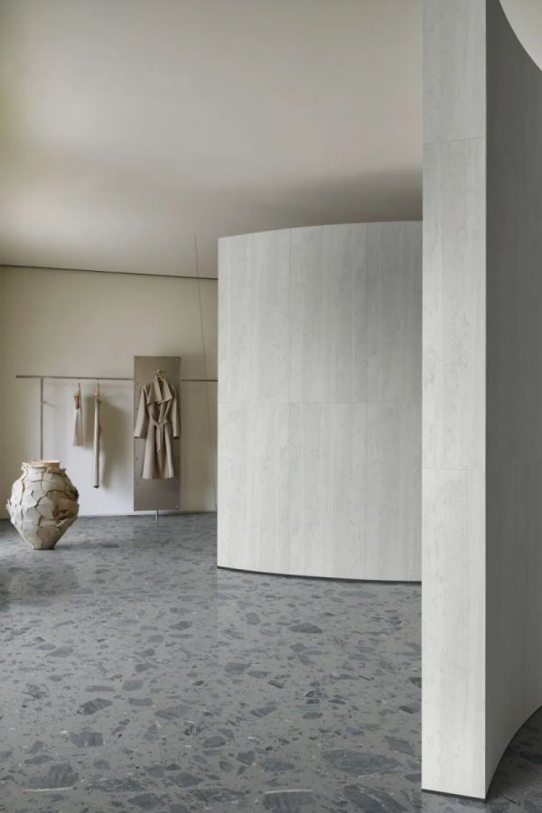 对比传统水磨石,产品突显了天然石材的原始质感和肌理,同时结合不同的工艺面处理,能够呈现出既粗犷又精致、既自然又现代的美学效果。当光影流淌于骨料表面,超大骨料的立体层次被全然激活 —— 大块骨料的雄浑气势,与细微纹理暗藏的自然密码相互交织,让空间在粗犷质感与细腻肌理间达成奇妙平衡。