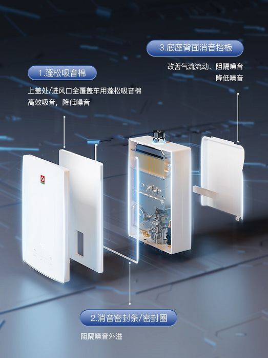 机身的上盖处和进风口全覆盖车用蓬松吸音棉,可有效吸收运行时产生的高频噪音;消音密封条、密封圈与底座背面的消音挡板形成多重防护,既能优化气流流动效率,又能牢牢阻隔噪音外溢,让热水器运行时的噪音降至极低水平。从此,用户无需再掐着时间卡点洗澡,沐浴时间更自由,随时随地都能沉浸在安静舒适的热水体验中,享受安静无扰的用水体验。