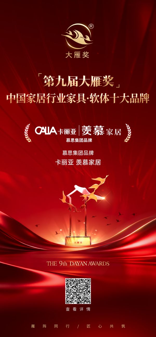 喜报!卡丽亚、羡慕家居荣膺「第九届大雁奖·中国家居行业家具·软体十大品牌」奖项