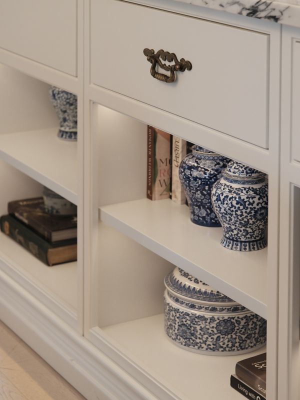 开放式餐厨空间,引人注目的是一座以全球收集的克拉克瓷片精心拼嵌而成的烤炉。这座令人震撼的青花瓷烤炉,巧妙嵌入白色漆面的橱柜与岛台构建的现代场景中。图森特别甄选的山纹白橡木皮,以天然舒展的纹理,为纯净的白色基底注入了细腻的暖意与呼吸。