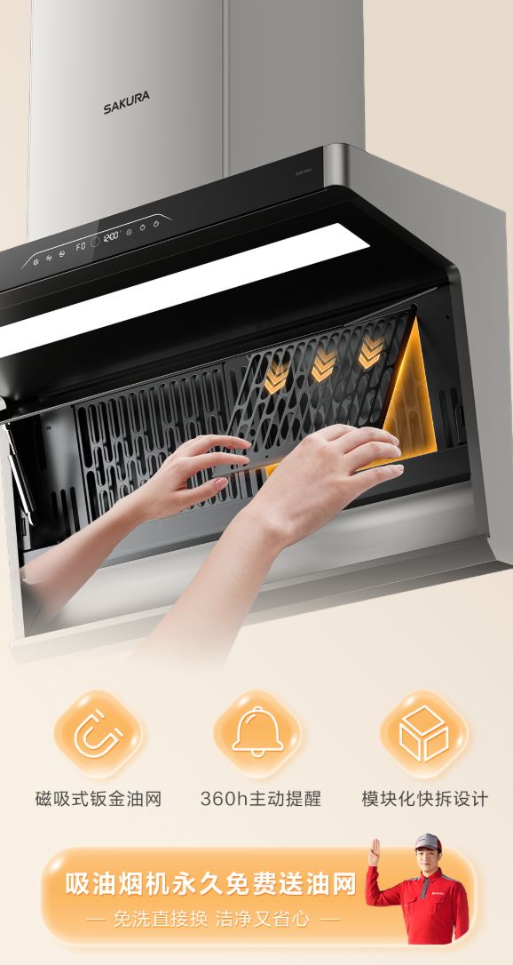 结构上,樱花吸油烟机Q602采用磁吸式钣金油网和模块化快拆设计,双手轻轻一拉即可取下,轻松清理每一个角落,无死角困扰。内置智能换网提醒系统,可在使用达到360小时自动提示,让用户清洁维护更科学便捷,更贴心的是,樱花吸油烟机Q602提供永久免费更换油网的服务,用户无需担心油网老化或堵塞,免洗直换的体验,轻松保持吸油烟机高效运转与洁净如新。