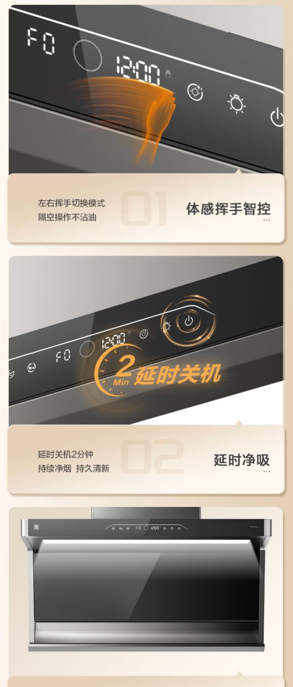 品质细节,尽显用心,樱花吸油烟机Q602以纤薄的机身演绎优雅格调,轻松融入多种家居风格。体感智控的设计,用户只需左右轻挥手,即可隔空切换模式,无需触碰,远离油污困扰。延时关机2分钟的贴心功能,持续净烟,让厨房空气长久清新。更有天幕大灯照亮美味,真实还原食材的新鲜色泽,让每一道佳肴都能在光影映衬下更添诱人风采。