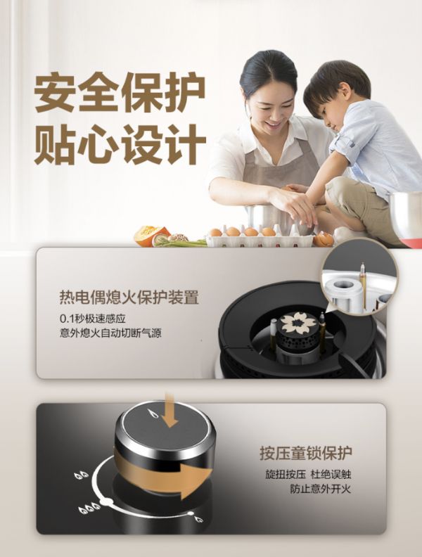 在安全设计上依旧贴心可靠。樱花燃气灶S507GA精心设计热电偶熄火保护装置,可在0.1秒内极速感应意外熄火,自动切断气源,有效防止燃气泄漏和意外事故,保障家庭用气安全。旋钮按压式的童锁设计,可进一步避免误操作,防止儿童误触造成意外,时刻守护安心日常。