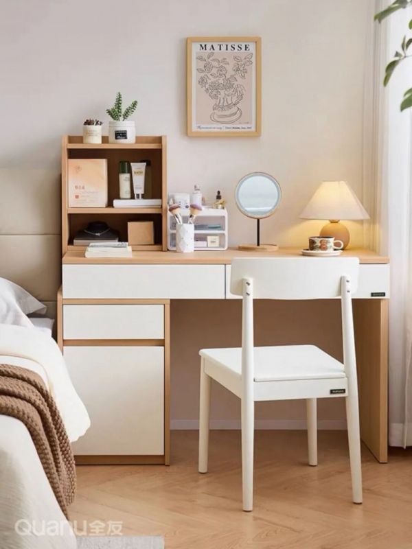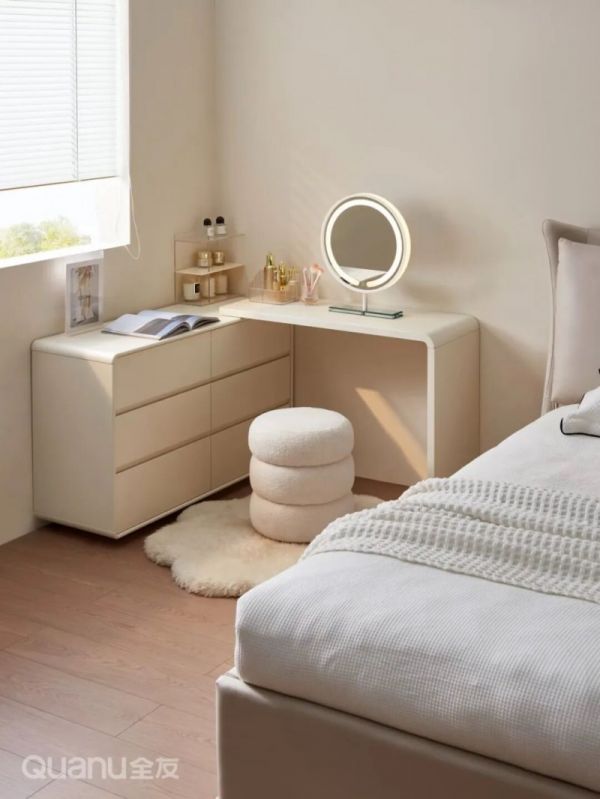 与其单独放置床头柜+单独规划化妆区,不如直接用梳妆台替代床头收纳。在床边就能实现化妆、护肤、收纳一体化,从起床护肤到日常储物一步到位,省心又省空间。