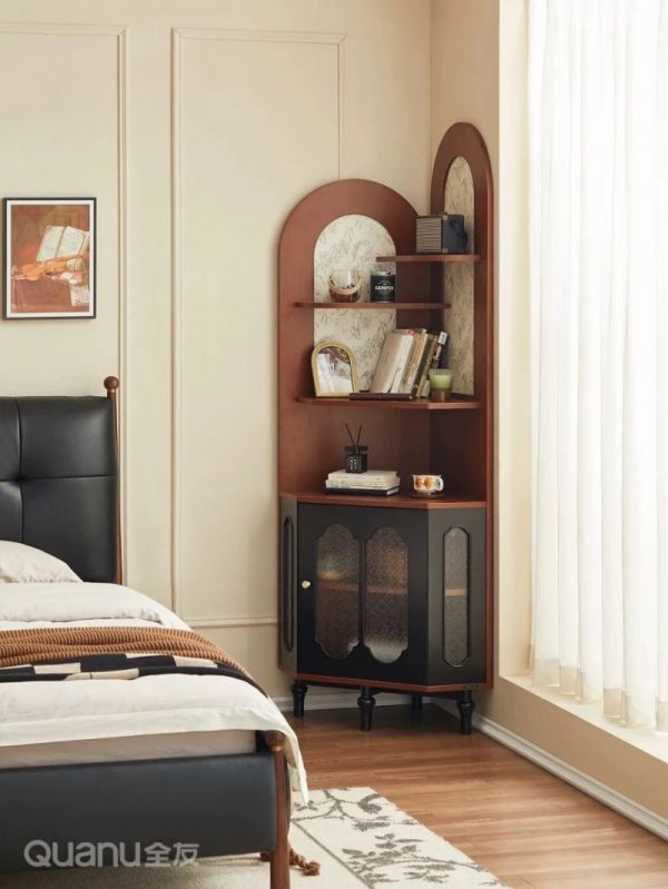 对于床头靠近拐角的卧室,放置传统床头柜往往会显得拥挤,此时不妨考虑用转角柜替代床头柜。转角柜可以嵌入卧室闲置空间,既不占用床边主要区域,又能将每一寸角落高效利用起来。