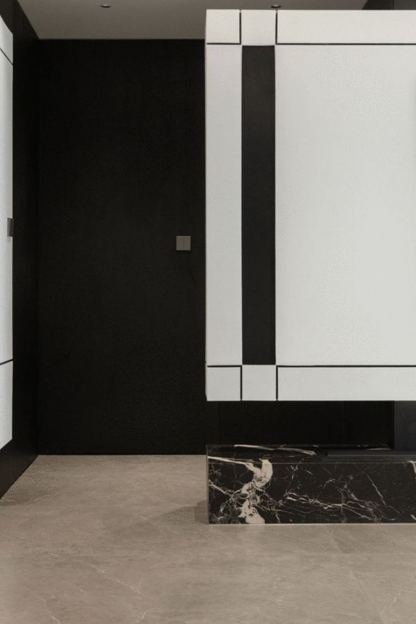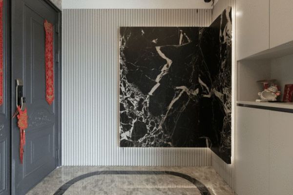 归家的仪式感,从电梯厅的第一眼开始。在正对面打造了材质选用欧文莱“时光盒子”的逸系作为玄关端景背景墙,它如同一件凝固的艺术品,自成风景。