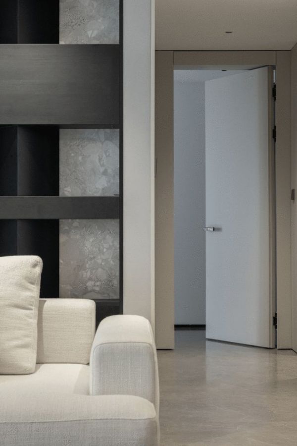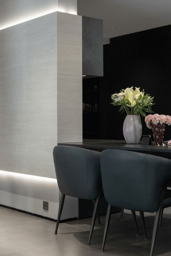 回应着整个空间“亲近自然”的设计主旨,穿过客厅,过道中的承重墙,没有刻意隐藏,而是选用了天然洞石进行包裹,其粗粝而温暖的肌理,成为家的第二大亮点。