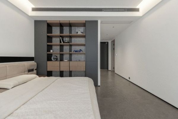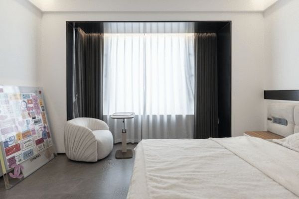 卧室的设计极其克制,极简的线条让空间安静下来,亮眼的主角,是屋主从国外寄回的收藏画作,让空间瞬间有了温度与故事。