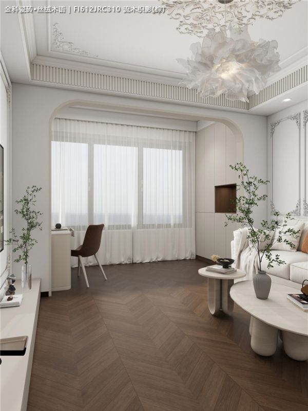 墙面通刷象牙白,搭配精致的石膏线,营造明亮轻盈的法式基底。地面则用沉稳的暖棕色鱼骨拼木纹砖牢牢压住空间,一浅一深,既有对比又极度和谐。白色沙发、纱帘和阳光的加入,让空间通透又高级,完全不会压抑。