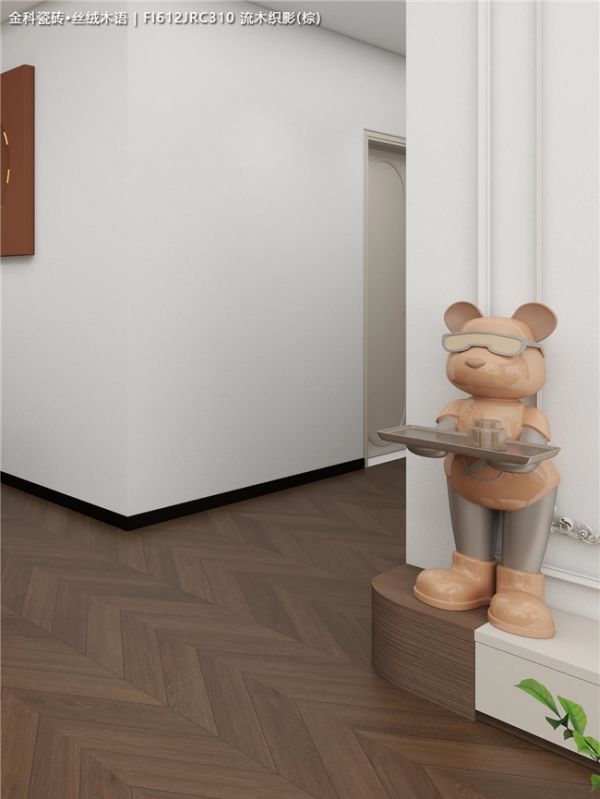 我选的这款木纹砖,纹理非常逼真自然,有细腻的木材肌理和恰到好处的色差,哑光质感温润柔和。它精准复刻了实木鱼骨拼的效果,但又比实木更耐磨、更好打理,不怕潮湿和地暖,是美貌与实用性兼顾的满分选择。