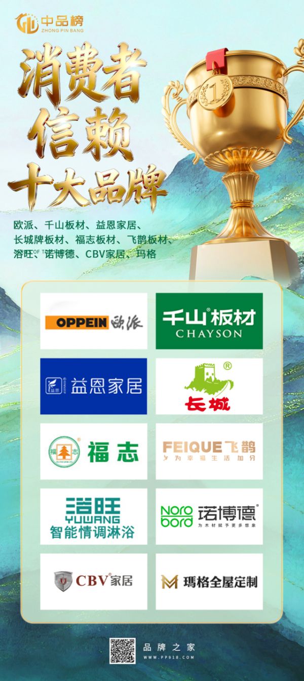 9、消费者信赖十大品牌:欧派、千山板材、益恩家居、长城牌板材、福志板材、飞鹊板材、浴旺、诺博德、CBV 家居、玛格