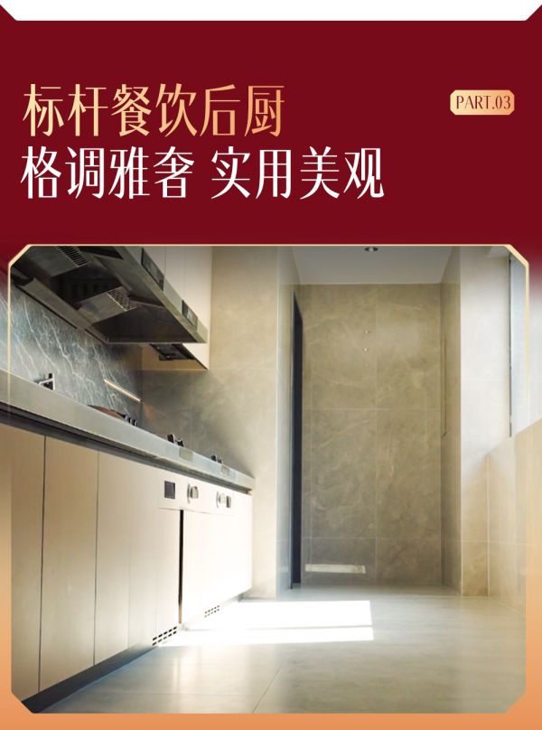 在标杆级餐饮后厨,选用冠珠普佩斯灰、静岚石云上两款灰色系产品,打造墙地统一的视觉界面。同时,瓷砖表面致密防污、耐腐蚀,适配后厨严苛的使用需求,兼具耐用、易清洁的优势,真正实现美观与实用结合。