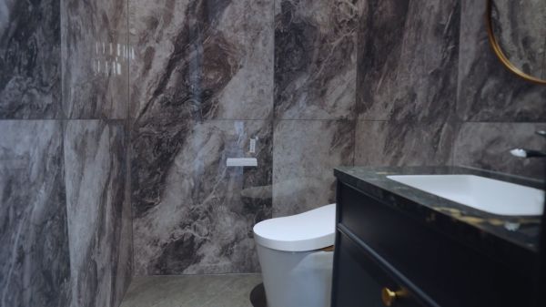 同样注重洁净与美感的卫生间,采用全抛釉瓷砖,深色水墨纹理气韵流动,在兼顾视觉美感的同时,充分满足功能需求。