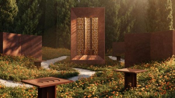 该装置以一座粗犷主义风格的浴疗空间为核心建筑,其设计灵感源自Flamingo Estate坐落在加利福尼亚山丘中的标志性浴疗空间,并全新演绎了科勒经典独立铸铁浴缸——搭配纯铜裙边,呈现层次丰富的铜色质感,彰显臻品工艺与不凡格调。整座装置静谧而富有象征意义,从风化金属与自然原生材质中萃取色彩与肌理质感,仿若从场地中自然生长而成,生动诠释了人与自然共生的设计哲学。