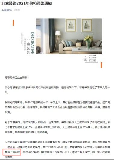 前几天,小编探店时也向非意装饰相关负责人求证过这则通知,负责人表示确有其事,2月将全线做价格上浮20%的调整。