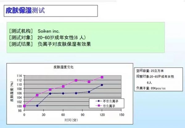 这下,没有了障碍,PE纯净生态模块释放的负离子就会附着在水分子上,使得水分子带负电荷。人体皮肤通常是带正电荷的,因此会吸收空气中带负离子的水分。从而减缓和抑制水分的挥发,使皮肤滋润保湿,吹弹可破,实现润肤美肌的效果。曾有测试机构对6名20-60岁成年女性进行了皮肤保湿测试,记录了两个小时内的皮肤湿度变化,测试结果表明,带有负离子的空气对皮肤保湿效果明显。