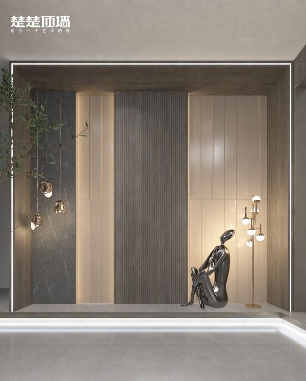 楚楚肤感卡奇灰墙板和定制蜂窝板错落组合,再配合灯带,从烦躁忙碌切换到放松舒适的状态,回归温馨的家庭生活。